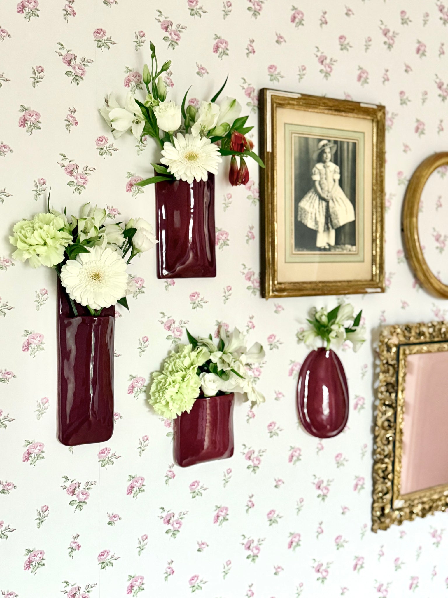 Long Vase mural en faience, fabriqué à la main à Paris. Émaille bordeaux aubergine. Environ 28x7x4 cm. Dispo sur commande dans la couleur de votre choix. CAP Céramique Artisanale Parisienne.