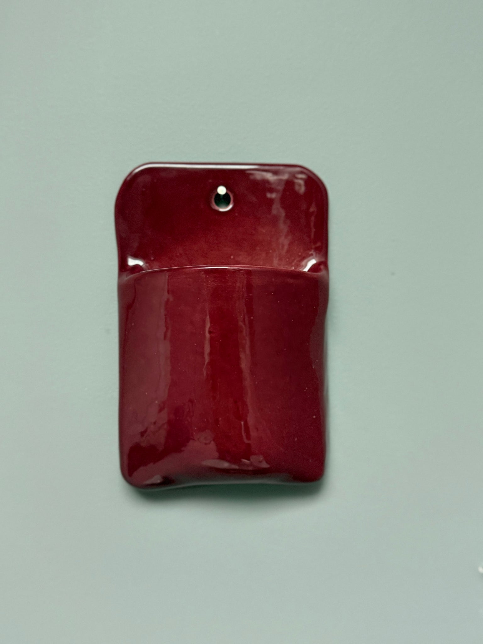 Long Vase mural en faience, fabriqué à la main à Paris. Émaille bordeaux aubergine. Environ 14x10x4 cm. Dispo sur commande dans la couleur de votre choix. CAP Céramique Artisanale Parisienne.