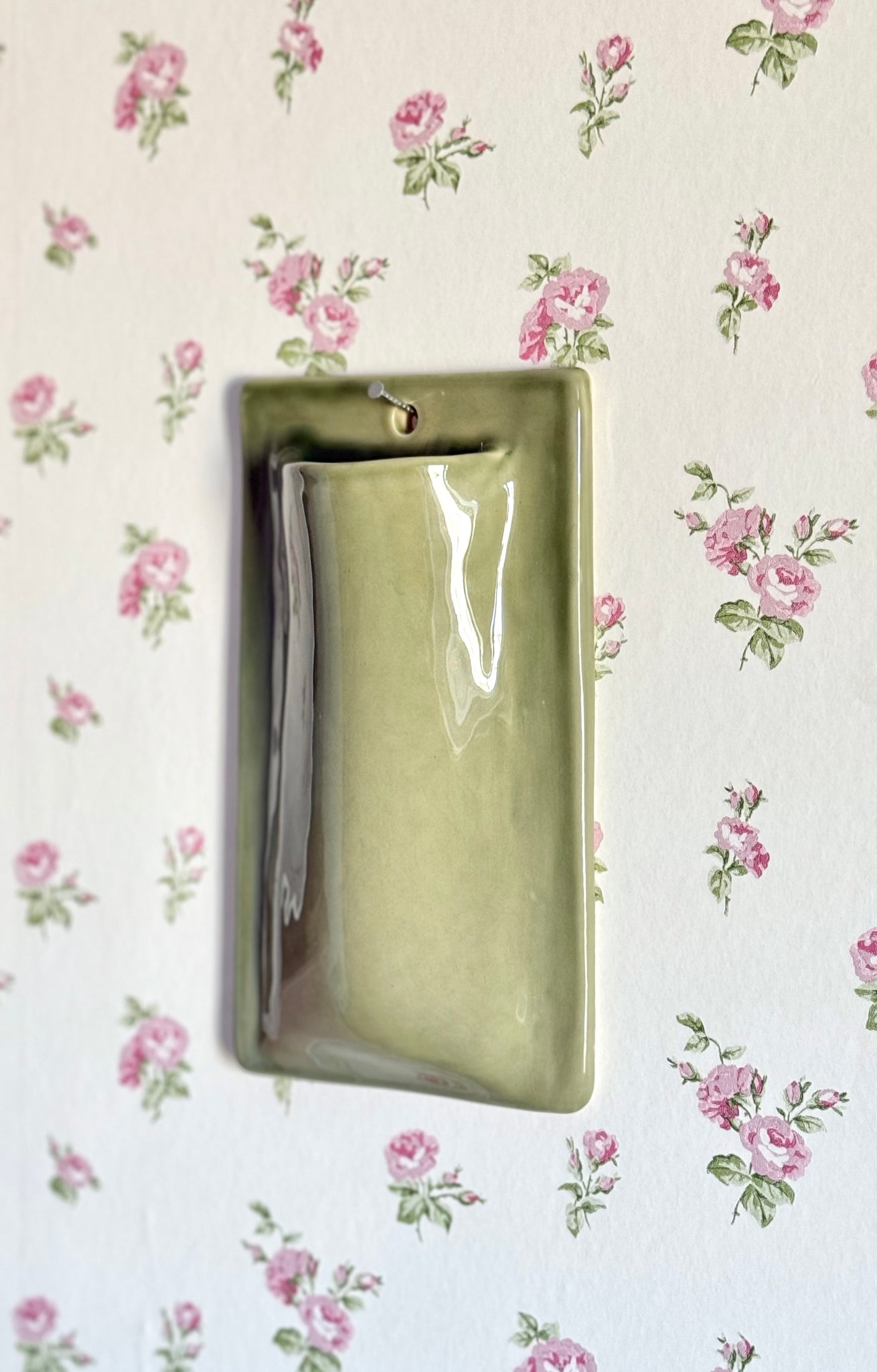 Vase mural en faience, fabriqué à la main à Paris. Émaille vert sauge. Environ 19x11x4 cm. Pièce unique mais équivalent sur commande dans la couleur de votre choix. CAP Céramique Artisanale Parisienne.
